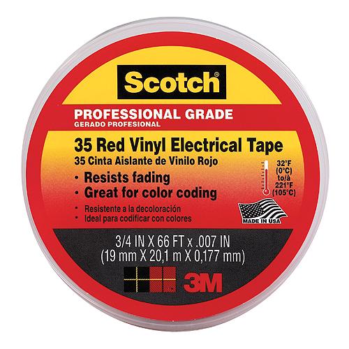 Scotch® Vinyl electrical color coding tape 35 is used in phase identification, color coding leads and piping systems and for marking safety areas. This tape is abrasion- and weather-resistant, with excellent mechanical and electrical insulation properties that wraps smoothly and holds tight over a wide range of temperatures. UL Listed and CSA Certified, and is flame-retardant.