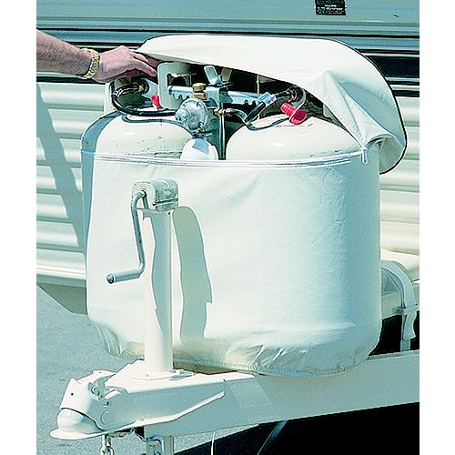 Protect propane bottles while in storage with this deluxe heavy-duty vinyl cover. Molded nylon zipper combined with a pressed wood top creates a more rugged and weatherproof cover (zipper and wood top not available on single model nor is it required to hold shape). Hollow bead welt cord and elastic shock cord provide a longer life and a neat tailored fit. 3-Year warranty.
