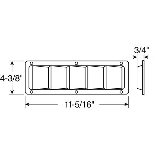 All-welded 304 stainless steel construction with polished finish. Adapts to 3" or 4" ventilation systems. Predrilled with six mounting holes to accommodate #8 screws. Dimensions: 11-5/16" L x 4-3/8" H x 3/4" D