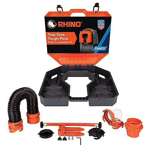 IncludesStorage case, 3' Rhino RV hose, 15" rinse hose, 4-in-1 adapter, 90° elbow, (2) storage caps, and mounting hardware