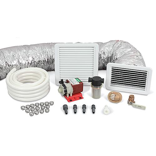Complete installation kit to install the EnviroComfort reverse-cycle retrofit units. Includes everything from supply and return air grilles to seawater pump to hose clamps. Includes:Supply grille, 12.5' R4.2 flex duct, return grille, 25' hose, ball valve, strainer with bracket and speed scoop, 5/8" thru hull, hose clamps, adapters, seawater pump, and couplings.