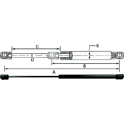 Combines all the proven reliability you've come to expect from an SPD Gas Spring along with the added feature of a nitride shaft. The GSNI Gas Spring incorporates a strong annealed steel rod with a Nitride coating for added corrosion resistance, especially when used with the all composite PS130 end fitting. This gas spring is an ideal choice where exceptional quality, combined with an overall black appearance, are important for your application. GAS SPRING FIT AND SELECTIONIf you already have a gas spring installed, selecting a replacement can be as simple as A-B-C. A. Measure the extended length from center mounting hole to center mounting hole (see "A" in diagram). B. Measure the amount of piston that is exposed while extended. This is called the stroke of the gas spring. (see "C" in diagram). C. Find the extended length that is the closest to your current unit. Then use either the stroke measurement or subtract the stroke from extended and select the compressed sizes that are closest to your current spring.(The measurements do not have to be exact but the closer you can match the original the easier it will be to install.) SELECTING THE FORCE - If your current spring has a stamped label, the force should be listed within that number. Usually, the last two digits or followed by the letter N which is Newtons. One pound equals 4.4482 Newtons. This is the pounds of force being exerted to open or hold open the door or platform. It does not equal the weight of the item being lifted. Trial and error is not the best way to find that number.