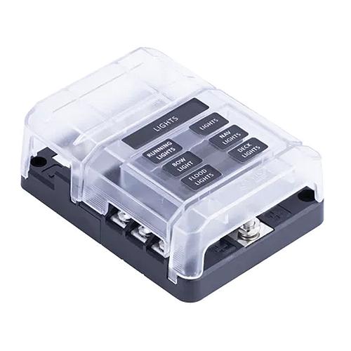 Accepts ATP/ATC/ATO blade style fuses up to 30A ABYC/USCG compliant transparent cover with recessed area for labels (60pc decal set included)Storage for 2 spare fusesLED indication of blown fusesMax Voltage Rating: 32VDCRating per Circuit: 30AMax Cumulative Rating per block: 100ATerminal Stud Size: M5Screw Size: M4