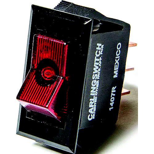 Interior , narrow body rocker switch with blade terminals. Fits in .550 x 1.15" cutout. Rated 10A @12VDC. Illuminated light glows Red in on position.
