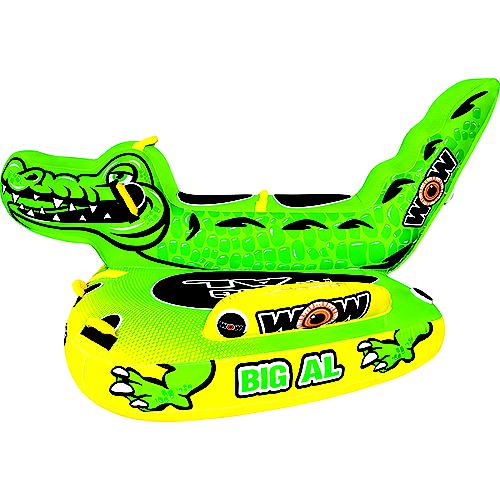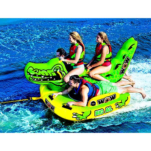 See you later Alligator! That's what you'll say before you head out on the water with BIG AL. This custom, double deluxe deck tube features a WOW BIG AL theme, two secure saddle seats to ride the beast as well as a large, deck area for 1 to 4 riders to sit, stand, kneel, or lay down. Each side of the deck area has custom EVA foam body pads and a side bumper system built on the edges to keep the riders from falling off when BIG AL gets wild on the water. Not to worry though, this 'gator doesn't bite! 1-year warranty. 680lbs. 308kg. Maximum CapacitySECURE SADDLE SEATING for 2 riders with EVA foam pad seating and a custom HI-PROFILE BIG AL tail to hold you on for a secure rideSide bumper system to keep riders on the tube when the ride gets extremeLarge, EVA foam body pads on the deck for the side ridersHeavy-duty, wide-webbed, 3-point tow system constructionMultiple riding positions; ride, sit, lay, stand, or kneelBuilt in Molded EZ TOW CONNECTOR for EZ tow point hook upHeavy-duty full nylon cover with heavy-duty zippersHeavy-duty PVC bladdersDouble webbing foam handles with EVA foam knuckle guardsZippered valve coversSpeed Valve for fast inflation and deflation