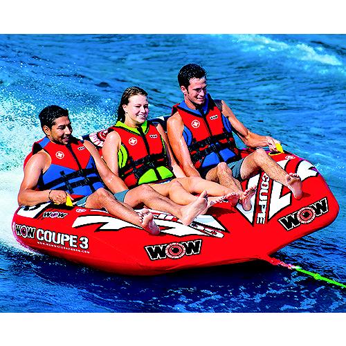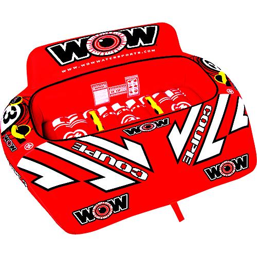 The Coupe Series is another WOW take on an old design. We took out the seat dividers on the basic cockpit tube so that we could add our drop bottom design. This turns your basic cockpit tube into not only a towable that is fast and balanced over the wake and in the whips, but also a comfortable and relaxing floating lounge that will be just what you need after your exciting ride. Hot rod red design. Try the Coupe 1, 2, or 3 rider towable/lounge and save on space in your boat by taking just one item with you instead of two.New Innovative SECURE COCKPIT SEATING™ with backrest and ergonomic slanted leg rest design for comfortable riding or lounging The new slanted leg rest design allows for the rider to naturally ride or lounge in a comfortable secure position Drop speed bottom allows for EZ fuel efficient towing with less drag on the boatHeavy-duty tow system construction featuring front tow pointHeavy-duty partial nylon coverHeavy-duty PVC bladdersWOW's custom red hot rod racing stripe design with billboard graphicDouble webbing foam handles with EVA foam knuckle guardsZippered valve coversSpeed Valve for fast inflation and deflationHeavy-Duty partial nylon cover tube makes for a great river tube while lounging