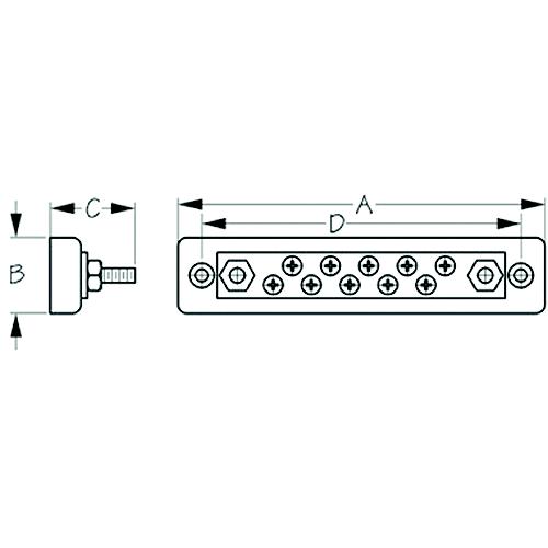 Buss Bar Screw-Temrinal Blocks are each equipped with a two 1/4" studs for main wire connection. Maximum: 48VDC. Installs with two #10 RH fasteners (not included). 426722 has certification by ISO, ABYC, SAE, USCG, and CE low voltage directive standards.
