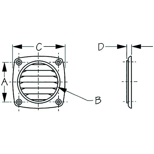 | 354-3373261 | Sea-Dog 3373161 Flush Hose Vent, A: 2-13/16" , B:2-3/4", C:3-11/16", D:5/16", Hose/ Hole Size: Up to 3", Black |
