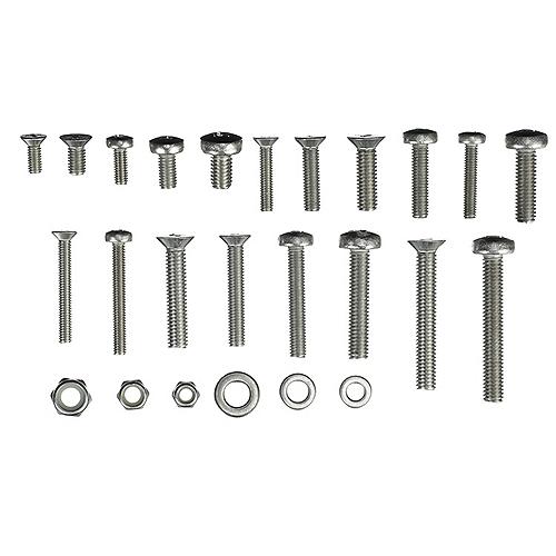 Stainless Steel assortments are packaged in compartmented strong, clear plastic re-closable storage cases. Kit Contains:(8) M4 x 10 Pan Mach. Screws(8) M4 x 20 Pan Mach. Screws(4) M4 x 30 Pan Mach. Screws(8) M5 x 10 Pan Mach. Screws(8) M5 x 20 Pan Mach. Screws(4) M5 x 30 Pan Mach. Screws(8) M6 x 10 Pan Mach. Screws(8) M6 x 20 Pan Mach. Screws(4) M6 x 30 Pan Mach. Screws(4) M6 x 40 Pan Mach. Screws(8) M4 x 10 Flat Mach. Screws(8) M4 x 20 Flat Mach. Screws(4) M4 x 30 Flat Mach. Screws(8) M5 x 10 Flat Mach. Screws(8) M5 x 20 Flat Mach. Screws(4) M5 x 30 Flat Mach. Screws(8) M6 x 20 Flat Mach. Screws(4) M6 x 30 Flat Mach. Screws(4) M6 x 40 Flat Mach. Screws(20) M4 Lock Nuts(20) M5 Lock Nuts(20) M6 Lock Nuts(20) M4 Flat Washers(20) M5 Flat Washers(20) M6 Flat Washers