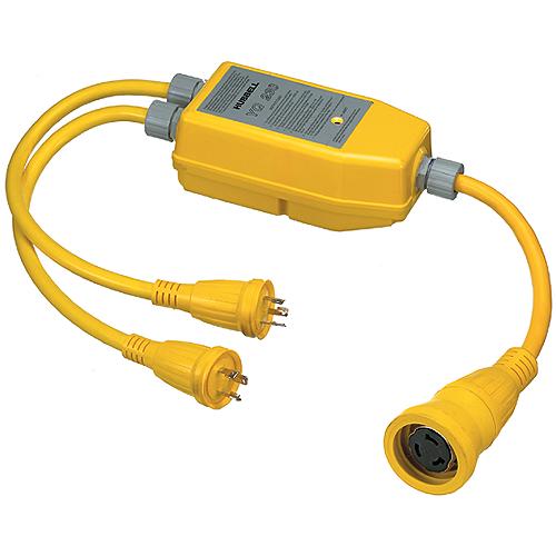 Safely powers 50 amp 125/250 volt boat from (2) 30 amp 125 volt receptacles at dockside. 4-pole contactor breaks both hots and both neutrals to prevent possible "live" plug when not engaged. UV resistant housing, 30 amp plug that connects to 30 amp shore power, safety indicator light, internal cord clamps, sealing grommets, anti-fog-rain-humidity environmental seal, 50 amp connector body that mates with boat cord set and Hubbell connector and plugs. Shuts off power if improper wiring condition exists on power center or if 1 plug is not fully engaged. Senses polarity of 30 amp receptacle on dock and (2) 30 amp receptacles from opposite phases.Note: The YQ230 Adapter will only work with two 30A receptacles that are on different phases. Not CSA Approved.