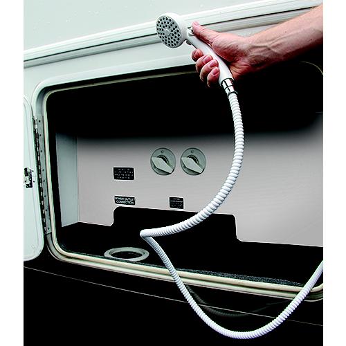 Easy-to-install; fits in RV's outdoor shower area High flow headConvenient on-off switch helps conserve waterWhite