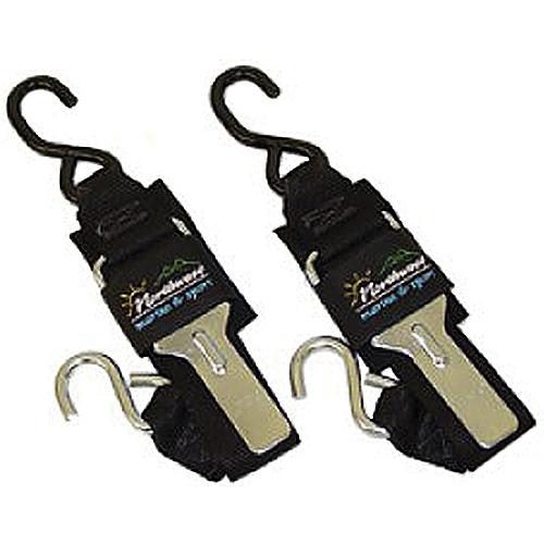 1-1/2" wide weather-resistant polypropylene webbing, heavy gauge zinc plated hardware and self-tightening, easy-lock over centering buckle with hook & loop pad to protect surfaces and secure loose ends. (1000lb.)