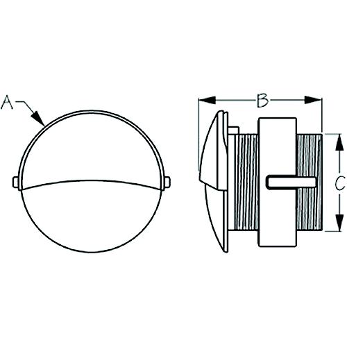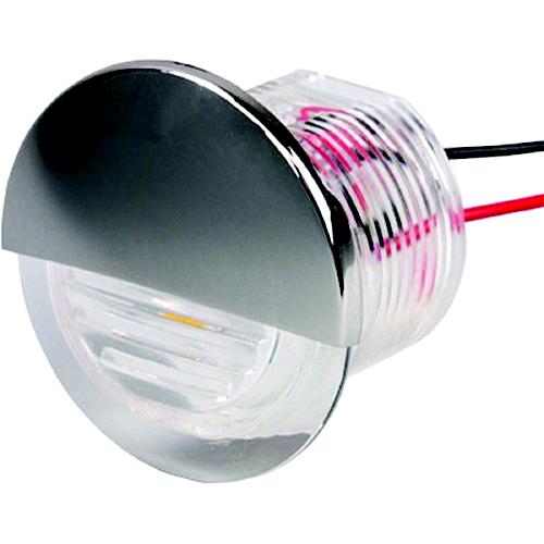 Fits in a 1-1/8" diameter hole. The special lens design aims the light downward and the stainless steel cover focuses the light, preventing it from projecting upwards. 20 lumens. Low amperage draws 0.02 amps @ 12V.