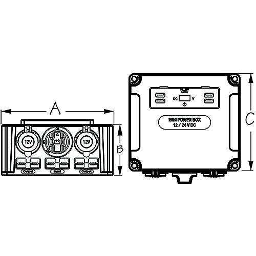 The Power Box is controlled with a 50A battery switch and is monitored with an LED voltmeter. Switch features a removable knob for extra security. Power box includes: two power sockets, two Anderson outputs, one USB-C, and four USB-A 2.4A ports. Features onboard internal fuse block. Great for Jon Boats & Kayaks. Anderson battery plug with terminals and four #8 FH mounting fasteners included. 12-24V. 50A.