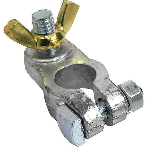 Clamp type wing nut terminal made of lead alloy. Brass plated wing nuts. 3/8" Positive stud. Fits all standard battery posts.