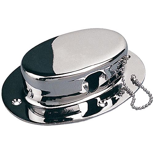These Chain Deck Pipes facilitate the storage of anchor lines out of the way below deck, reducing the risk of trip hazards on deck. Chrome plated forged brass construction. Oval deck pipe opening can accommodate a large thimble and line up to 1" in diameter plus the shackle and chain. Chain can remain in slot when the cover is closed. Installs with four #8 FH fasteners (not included).