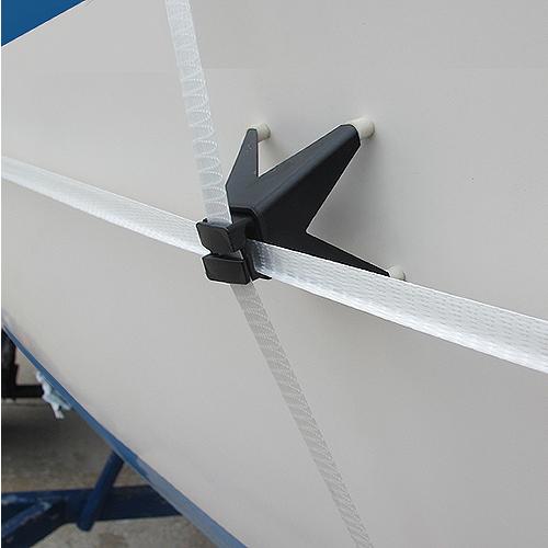 Used to separate shrink wrap from the product it is covering. Using strapping, buckles and a tensioning tool the Liftoff offers simple protection. This separation promotes air circulation and is extremely important on painted hulls where shrink wrap touching paint can cause blistering. It is easily installed and re-usable.