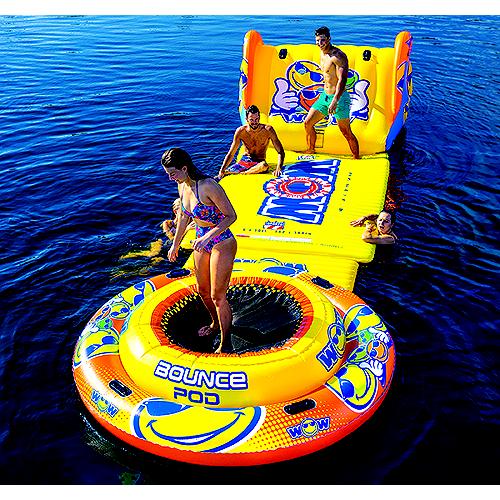 The Bounce Pod floating bouncing station gives you over 4' of bouncing space to get some hang time, or for just spending some chill time, on the water or the lawn. The Double-Ring technology adds an extra spring to your jump and makes it more stable on the water and is engineered without metal springs which increase user safety. 240lbs. maximum capacityInnovative double-ring technologyPlatform has 6' zipper to attach to other WOW Walkway items to build your own "On The Water Playground Paradise!" ( Also check out WOW Water Mat, WOW Water Walkway, Slide 'N' Smile)Bouncer Platform measures 7.5' wide for a stable bounce! Sits 20" tall.Use as a bouncer, a play center, or as your very own private island to lounge on in your favorite body of waterMade from heavy duty special grade PVC to hold up in the hot sunLarge floating boarding platform with molded boarding handles includedSpeed valves for fast inflation and deflation