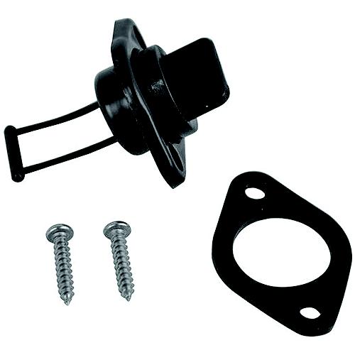 Molded black ABS plastic with threaded receiver. Molded retaining strap. Includes attaching screws and elastomeric gasket for a watertight fit.