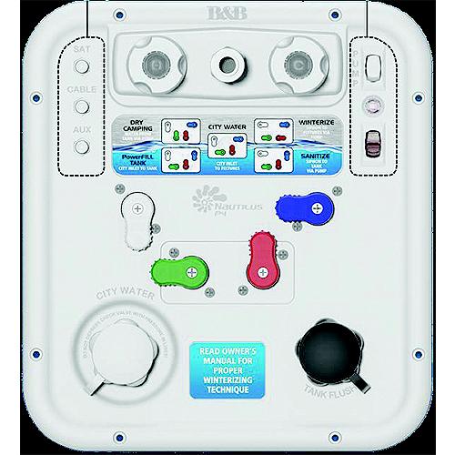 Panel system for multi-function water management. Interchangeable parts included. Meets listing requirements for the US and Canada. One city water inlet- Five functions:Powerfill fresh water tankSiphon fill/sanitize fresh water tankEasily winterize water lines and fixturesDry camp from fesh water tankPressurized city water supplyBuilt-in tank flushing systemLED pump switch for one person winterizingHot/cold faucet options:Quick connect shower faucetStandard faucet with hose and headEasy to follow color coded legendMultiple coax connectionsIncludes: LED Red/White Rocker Switch, Momentary Switch, 3-Way Rocker Pump Switch, 2 Blank Switch Hole Fillers, and 3 Hex Coax Plugs.
