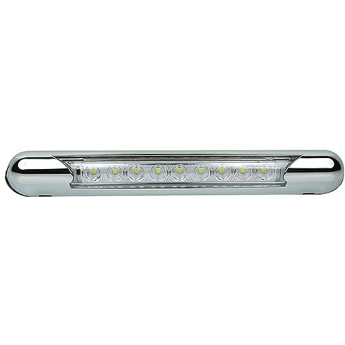 11" White LED awning light, no switch, white end caps, 9 Diodes. Raw output: 189 lumens, Effective output: 171 lumens. Low profile awning mount lights with wedge base that directs light at a 45° angleHard wired design includes both lead and ground wiresSealed, waterproofPolycarbonate lens and housing12.8VDC - .150A