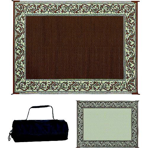 This reversible mat can be used indoors or outdoors-at home on the patio, next to your RV, in the park, garden, or at picnics, while camping, or at the beach. It can also be used under pet cages and in exercise pens. Easily clean it with a broom or water sprayed from a hose. The woven construction dries quickly to prevent mold and mildew. The durable polypropylene material is coated with UV protection to resist sun damage and fading. Corner loops can be staked to hold it in place. The mat folds into a compact size for storage and comes with a nylon carry bag. Breathable material wont damage grass. UV-coated to protect against fading and other sun damageSoft and durable 100% virgin polypropylene materialEasy to clean and resistant to mold and mildew - sweep away dirt or spray clean with waterLightweight and compact - it folds for easy storage into included carry bag