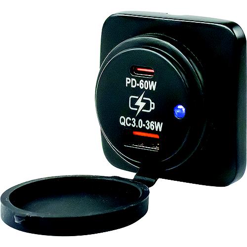 Surface mount USB 3.0 & USB-C Power Socket charges two devices simultaneously. When split, the total 6A output is 3A per side. USB 3.0 features Quick Charging (QC) for supported devices, giving enough power to charge phones, pads, and tablets quickly and efficiently. USB-C features Power Delivery (PD) for faster and more flexible charging. Protective dust cap covers ports when not in use. Constructed of injection molded nylon. Easy installation requires drilling a 3/16" hole for the wire connection, secure to surface with two #6 screws (not included) and snapping concealed fastener cover in place. Output DC: 5V/6A. Input: 8-32VDC. USB-C Watts: 60W@24V. USB 3.0 Watts: 36W@12V. Blue LED illumination. IP65 rating. CE, RoHS compliant.