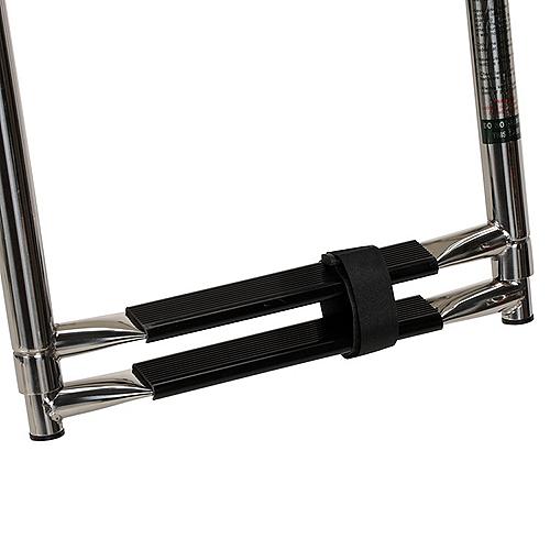Ladder is secured with a hook & loop strap when in the stowed positionFiberglass platformIncludes ladder and hardware for both outboard andinboard/outboard applicationsTelescopingMaintenance-free high strength platformBlack plastic treads provide a secure stepping areaAll stainless steel hardware included300 lb. CapacityPlatform: 14" L x 18" W Ladder Measurements 2 Step: Length deployed: 23". Length stowed: 13.5". Overall Width: 11.25". Step Tread: 7.25" x 1.5"